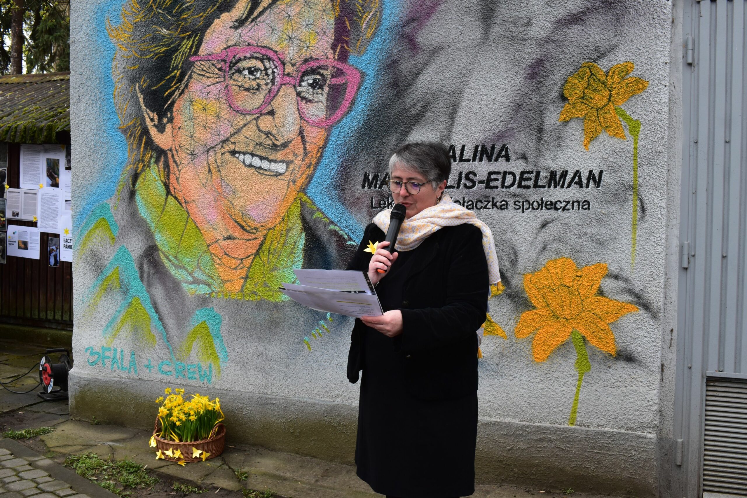 Cette fresque, visible depuis la rue Walecznych sur le site de l’établissement, est dédiée à Alina Margolis-Edelman, grande figure du soulèvement du ghetto de Varsovie et personnage emblématique de la relation franco-polonaise.