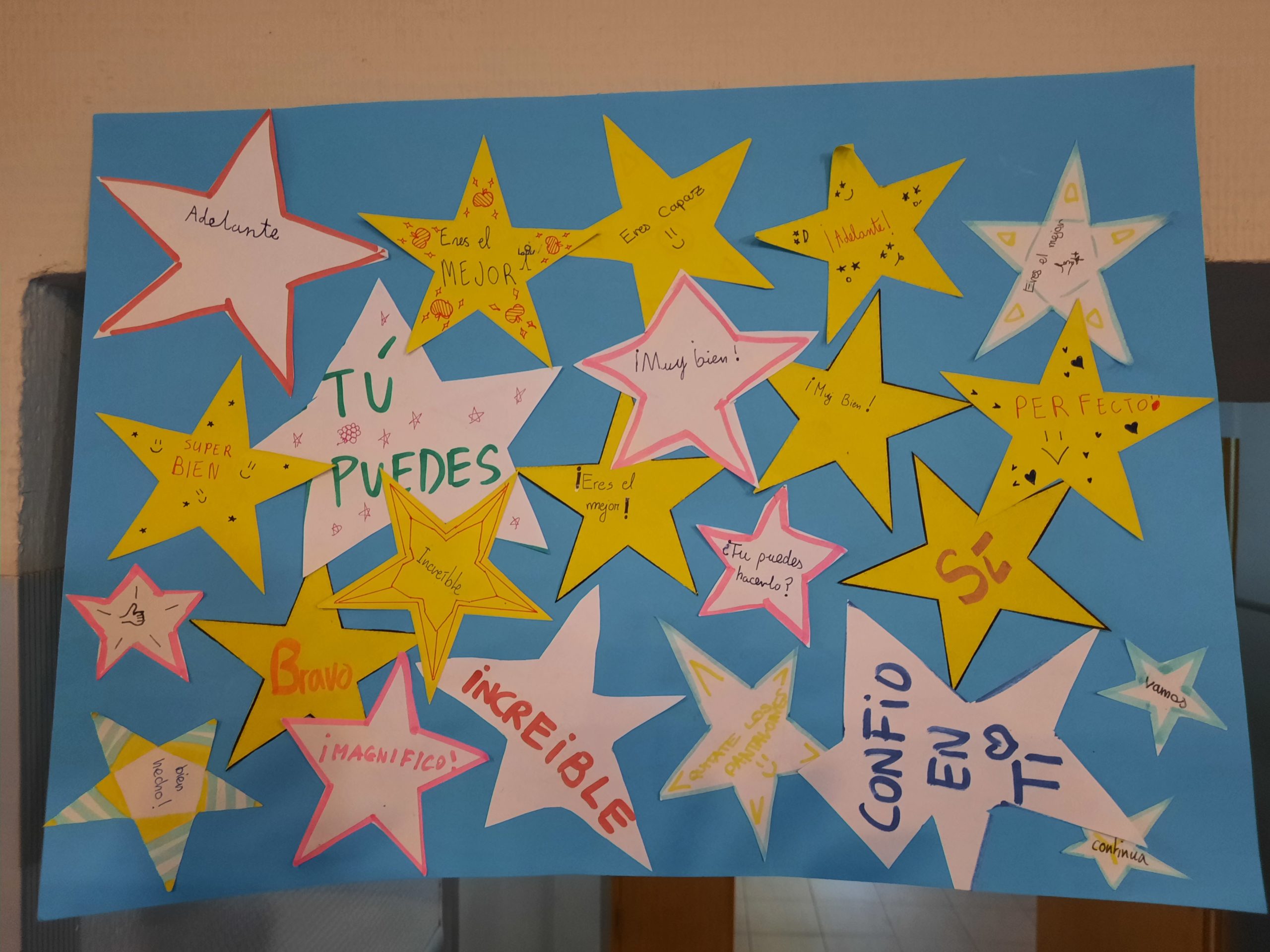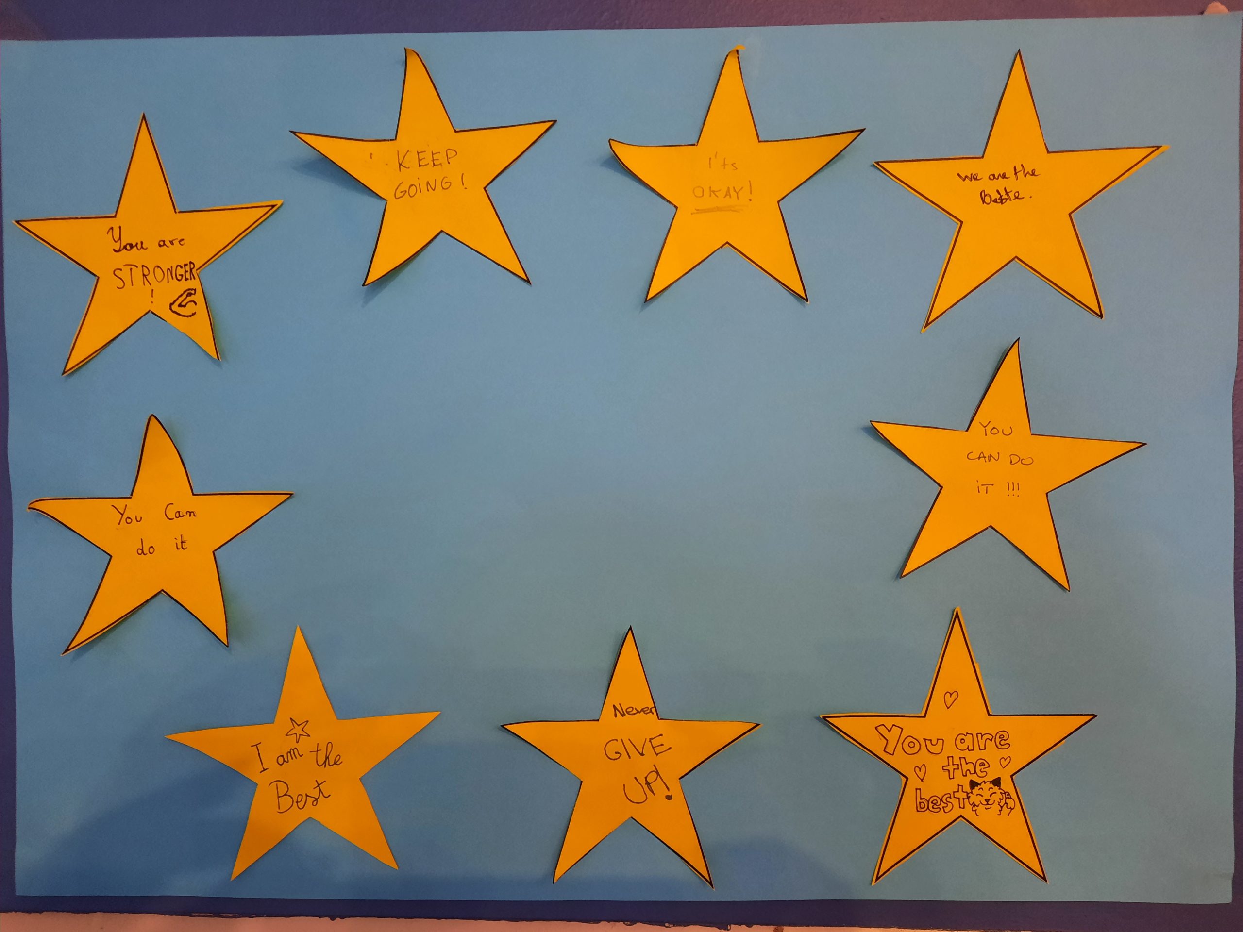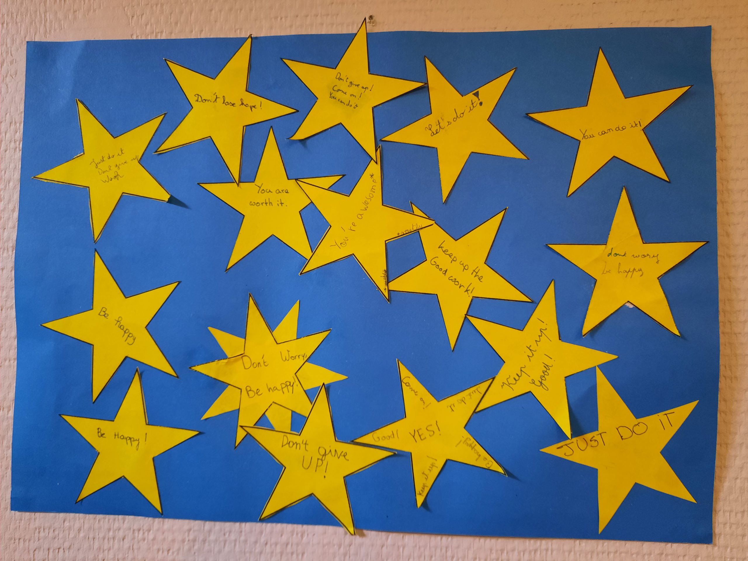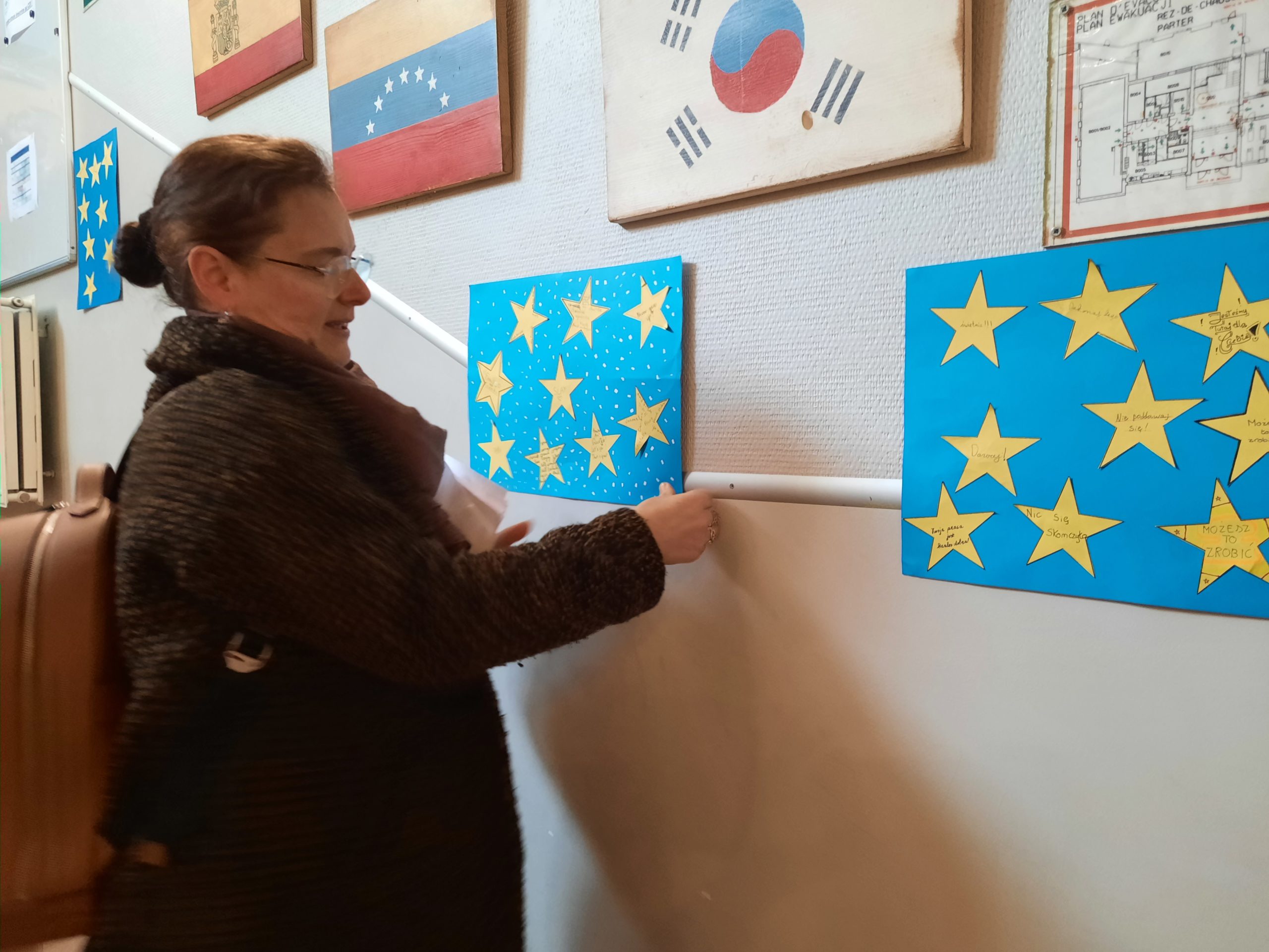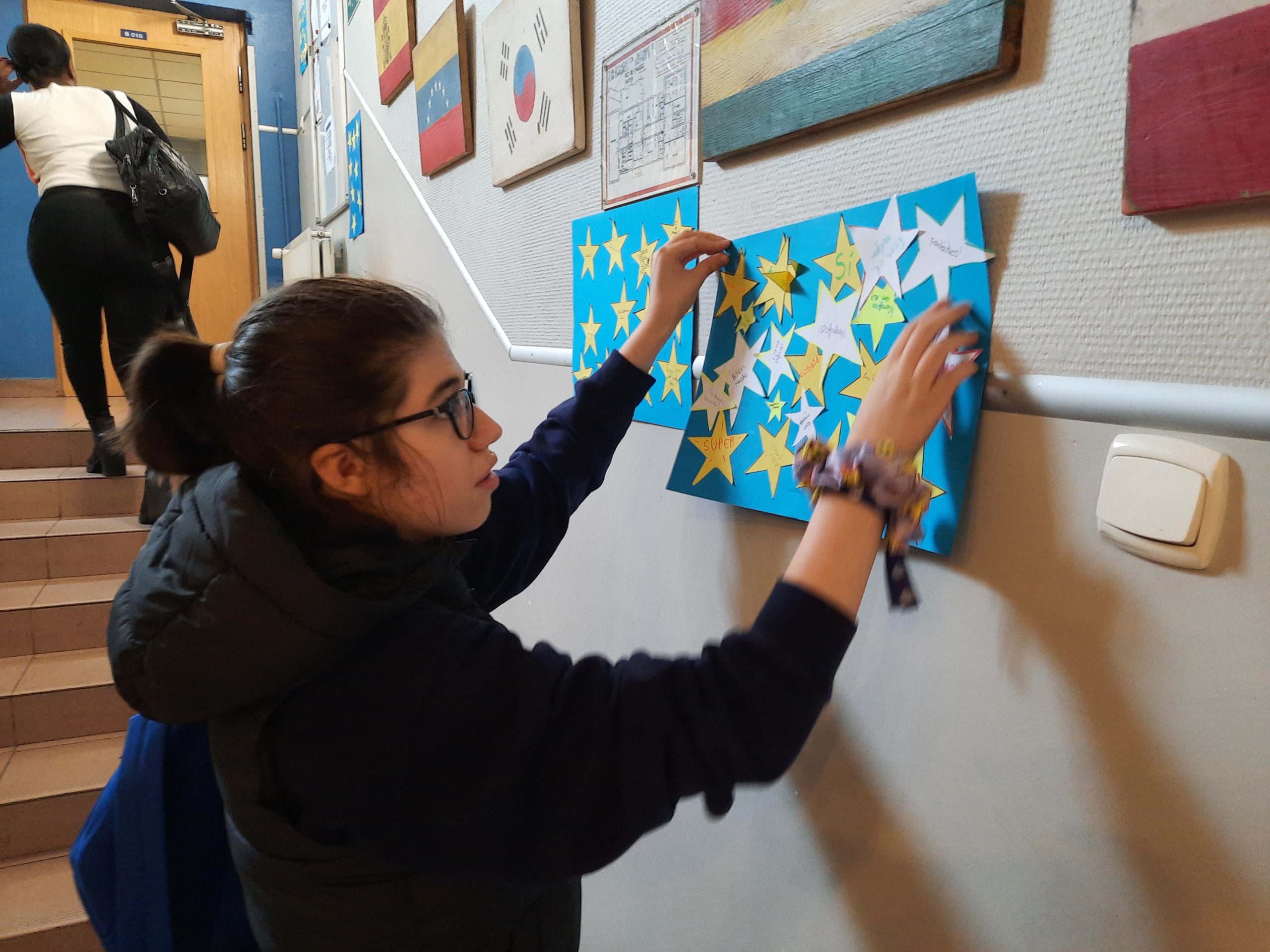 Nasi młodzi lingwiści najpierw napisali na kilku plakatach słowa zachęty i wsparcia we wszystkich językach, którymi się posługują i zawiesili je na ścianach korytarzy na Saskiej Kępie. Następnie, przy akompaniamencie pani Wójcik, klasy wspólnie zaśpiewały piosenkę „Debout les gars” Huguesa Aufraya.