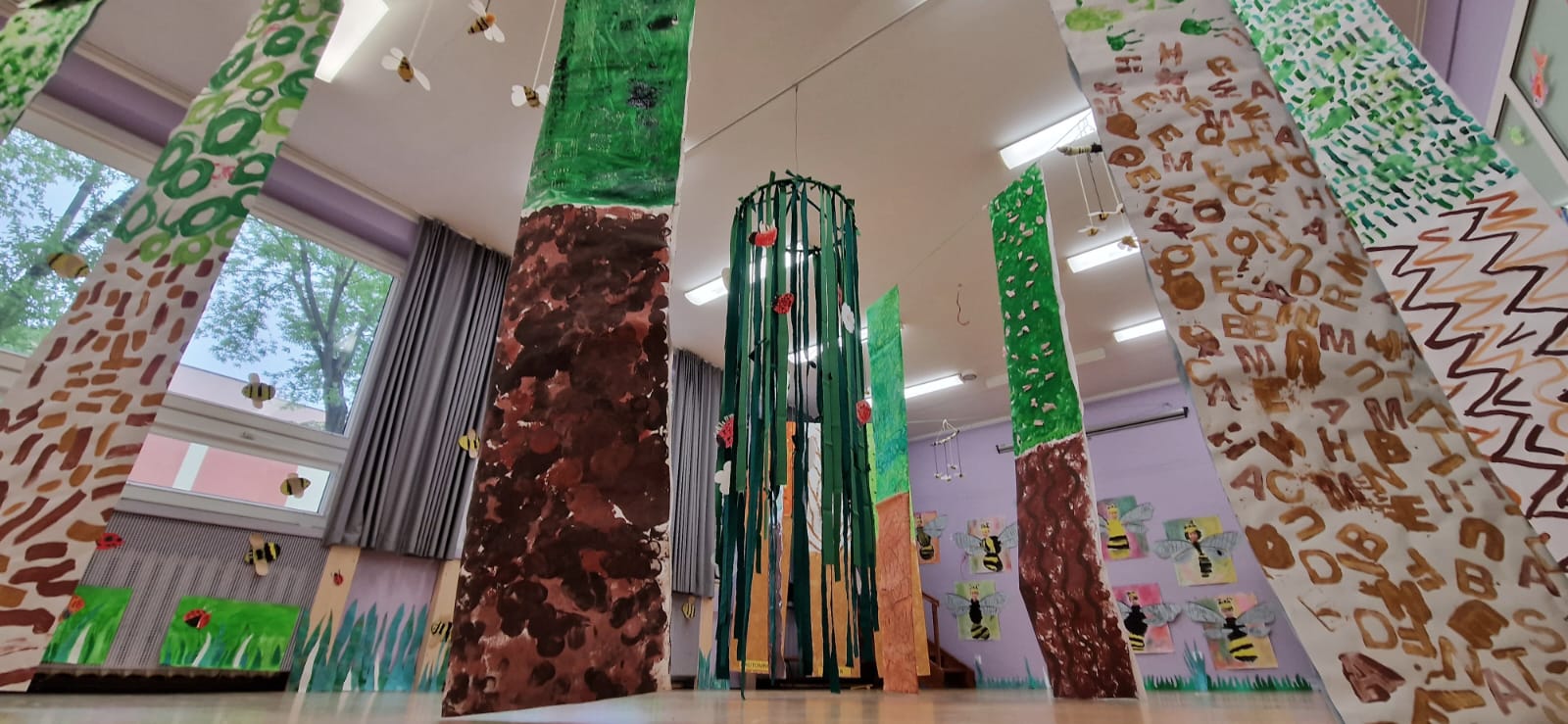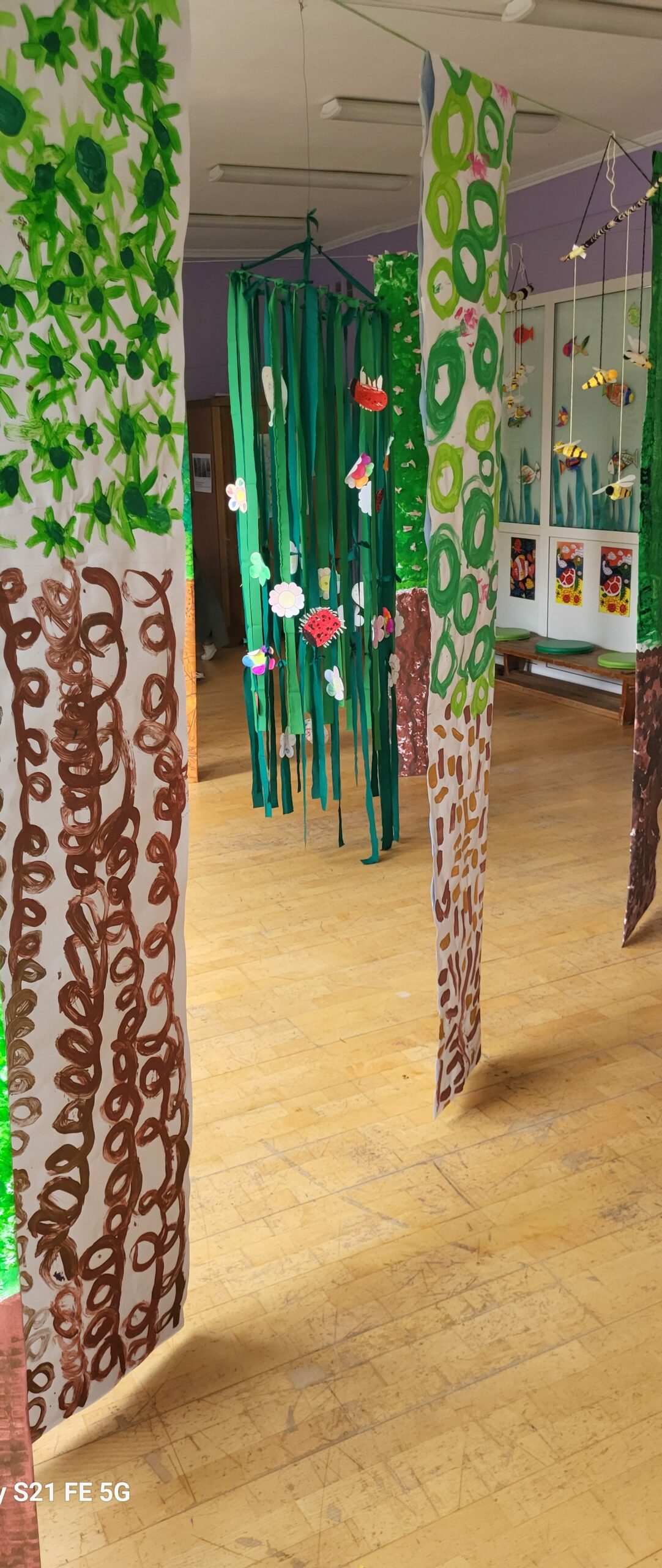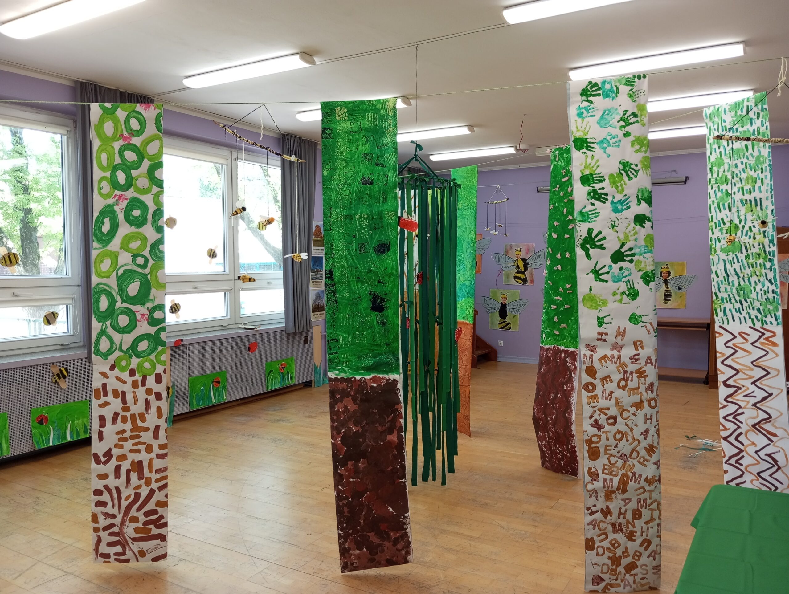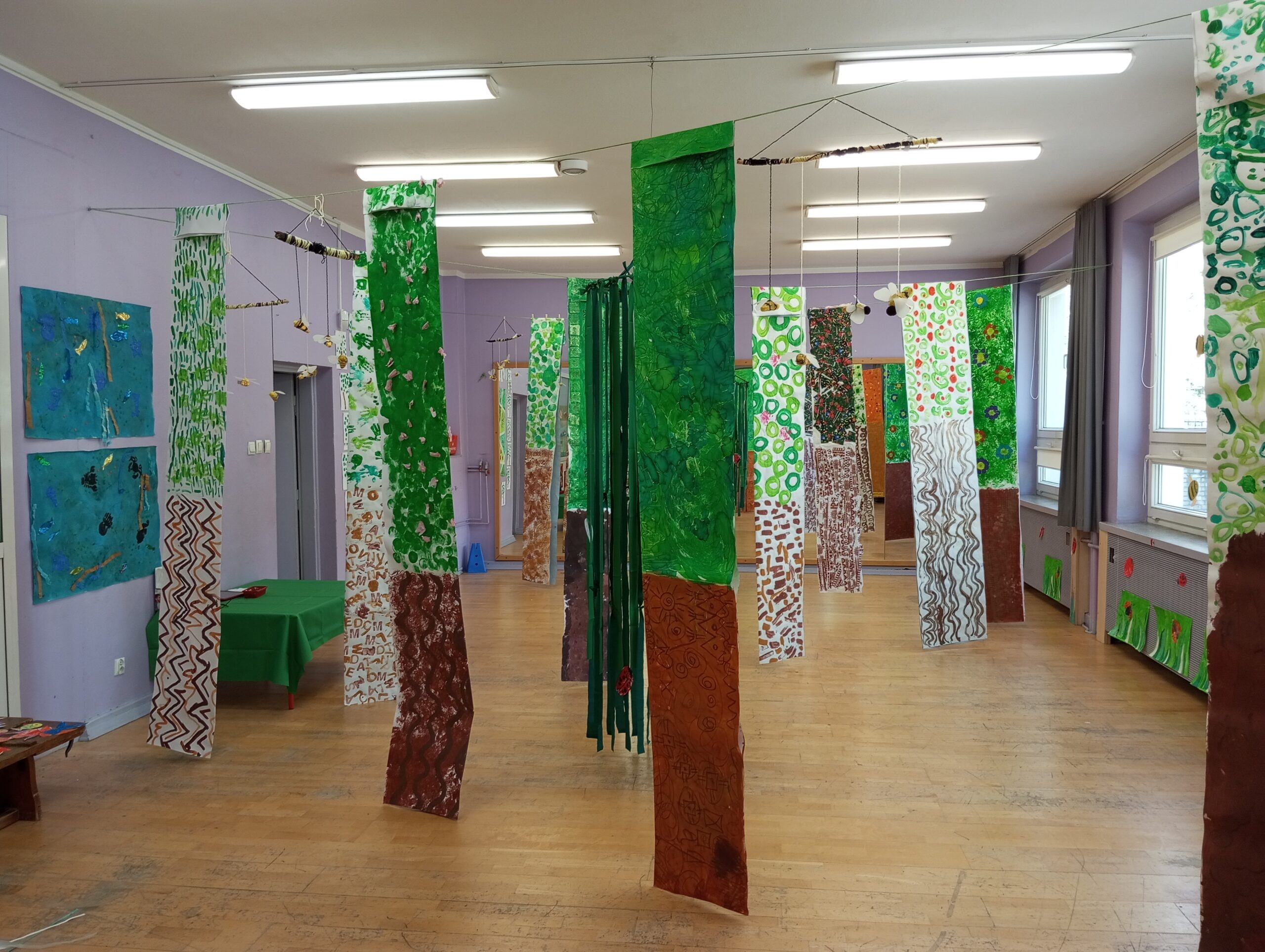 Sala taneczna zamieniła się w magiczny las, zamieszkały przez poetyckie drzewa i cudowne stworzenia. Dzieci z klasy GST uważnie obserwowały zmieniające się pory roku w szkolnym ogrodzie, a następnie odtworzyły kolory i kształty natury w swoich pracach. Świat morski i świat pszczół również zainspirowały ich kreacje, dając życie magicznemu wszechświatowi.