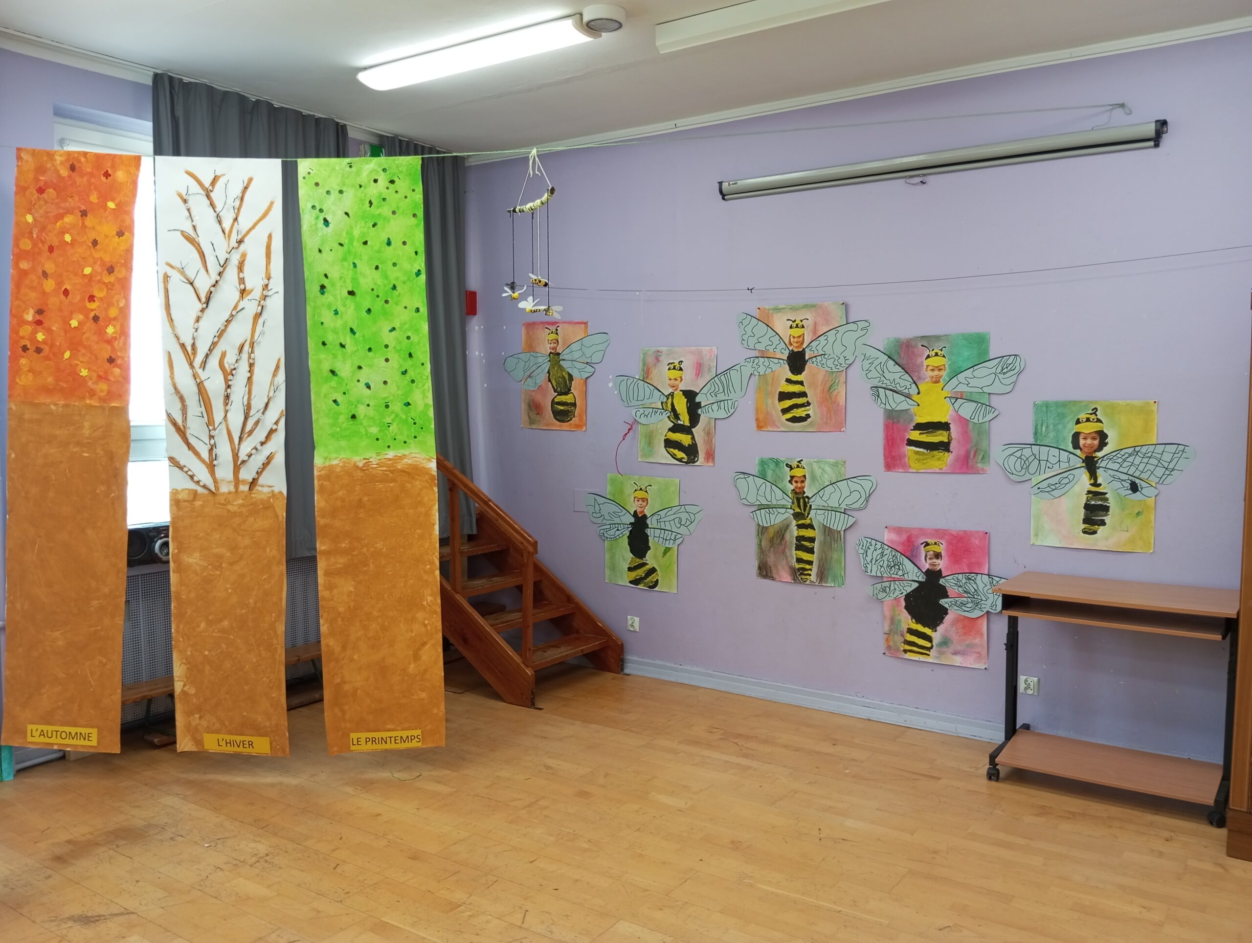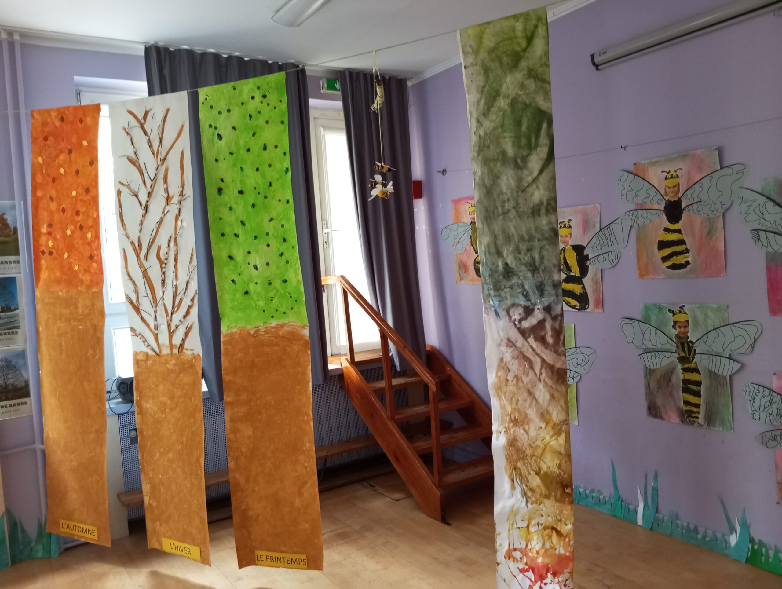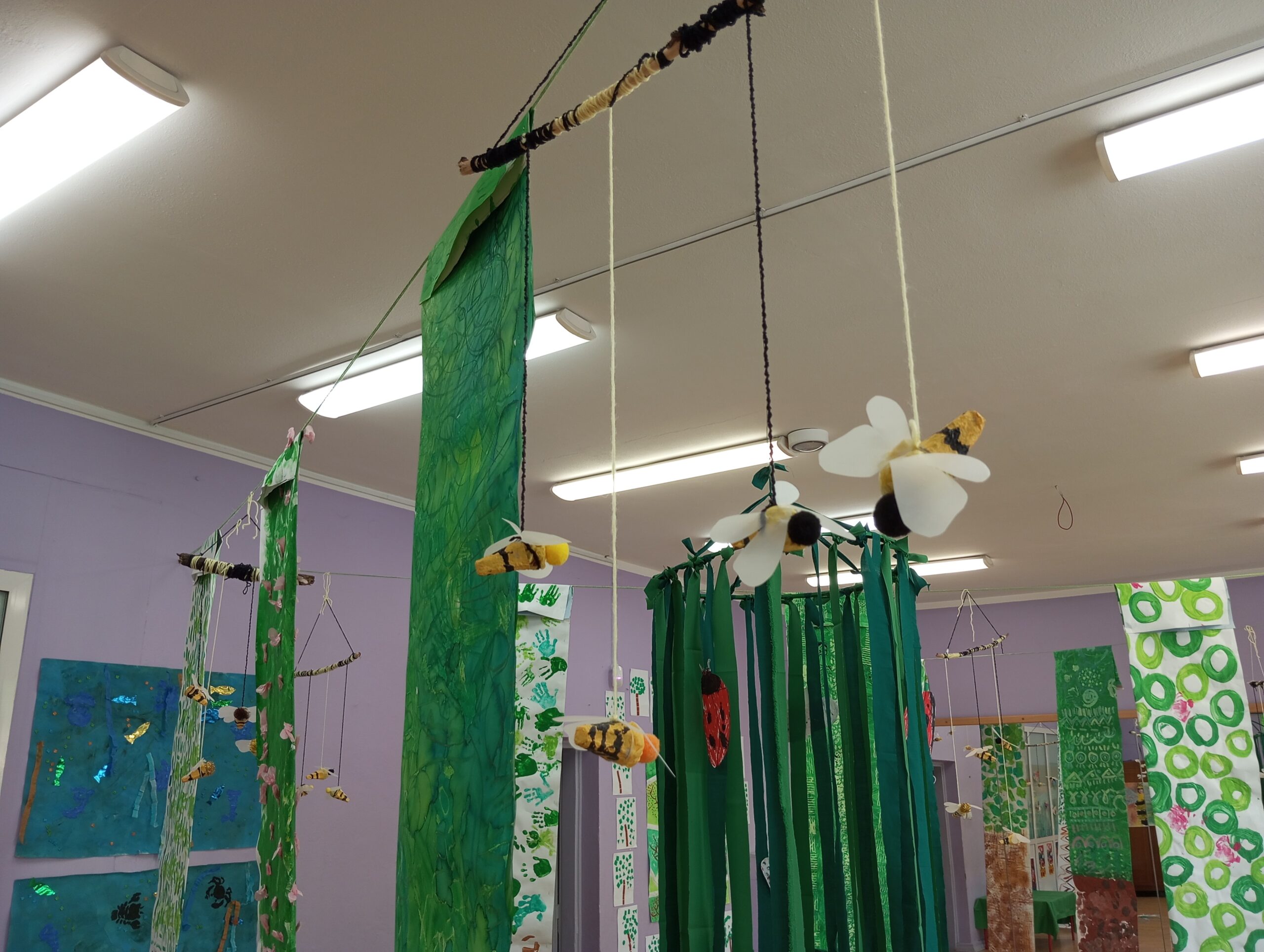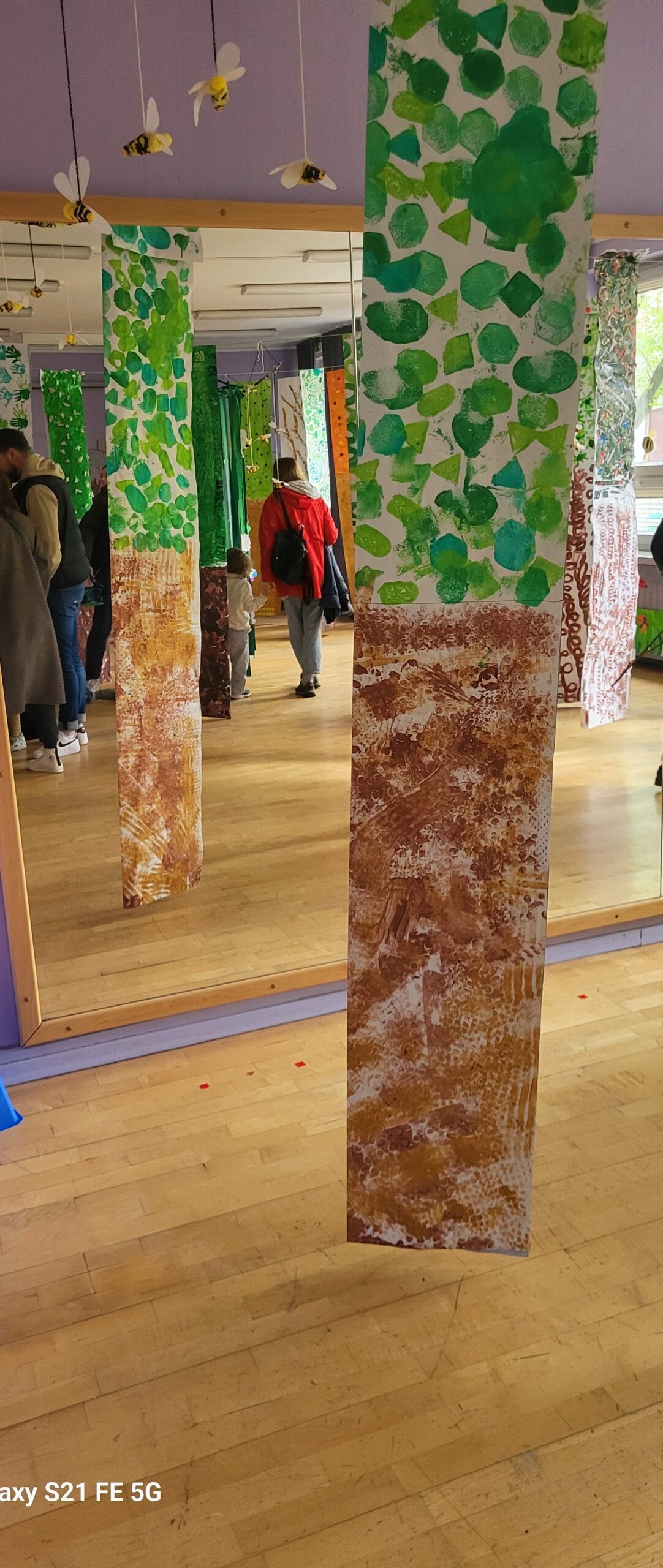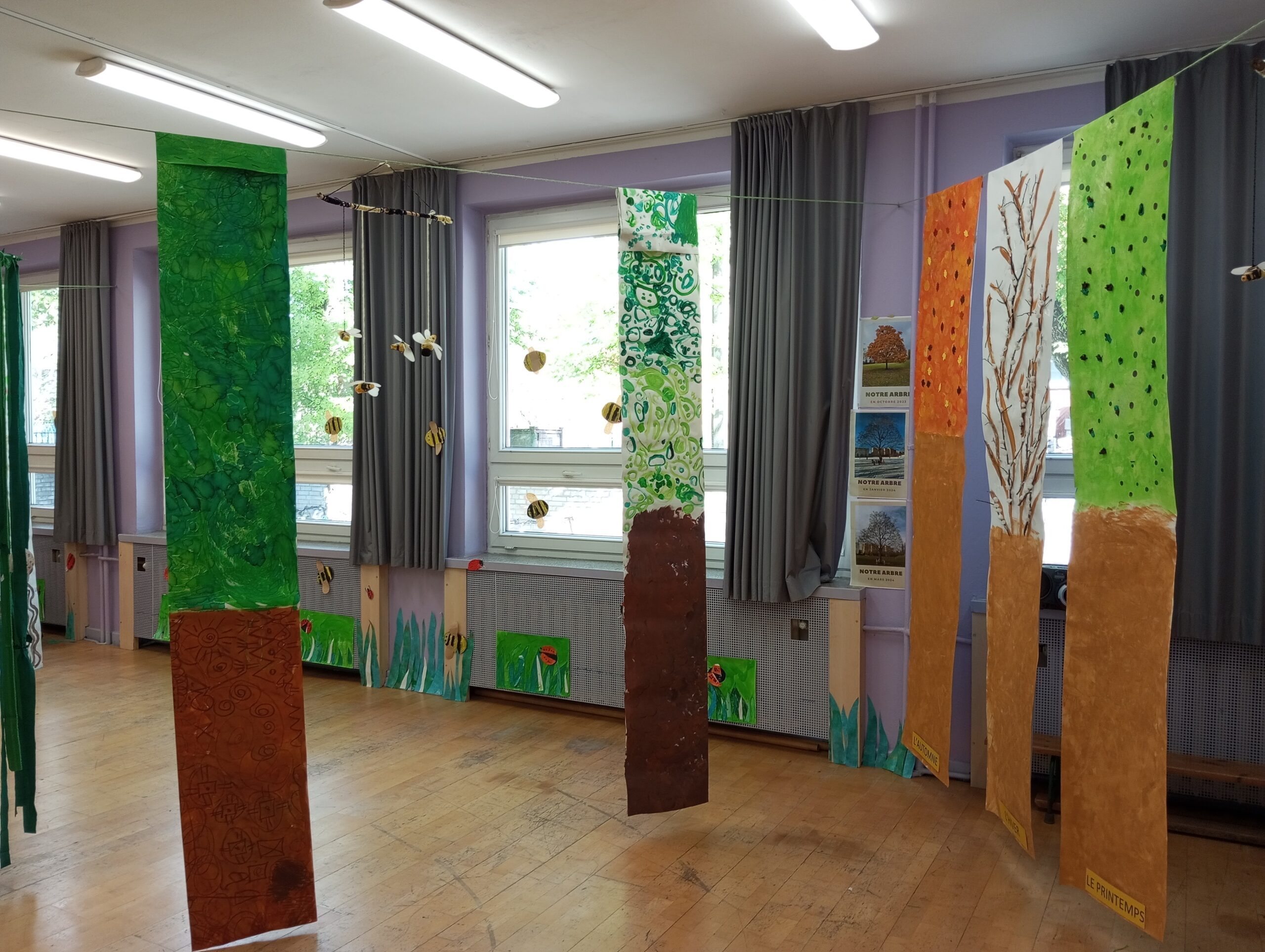 Sala taneczna zamieniła się w magiczny las, zamieszkały przez poetyckie drzewa i cudowne stworzenia. Dzieci z klasy GST uważnie obserwowały zmieniające się pory roku w szkolnym ogrodzie, a następnie odtworzyły kolory i kształty natury w swoich pracach. Świat morski i świat pszczół również zainspirowały ich kreacje, dając życie magicznemu wszechświatowi.