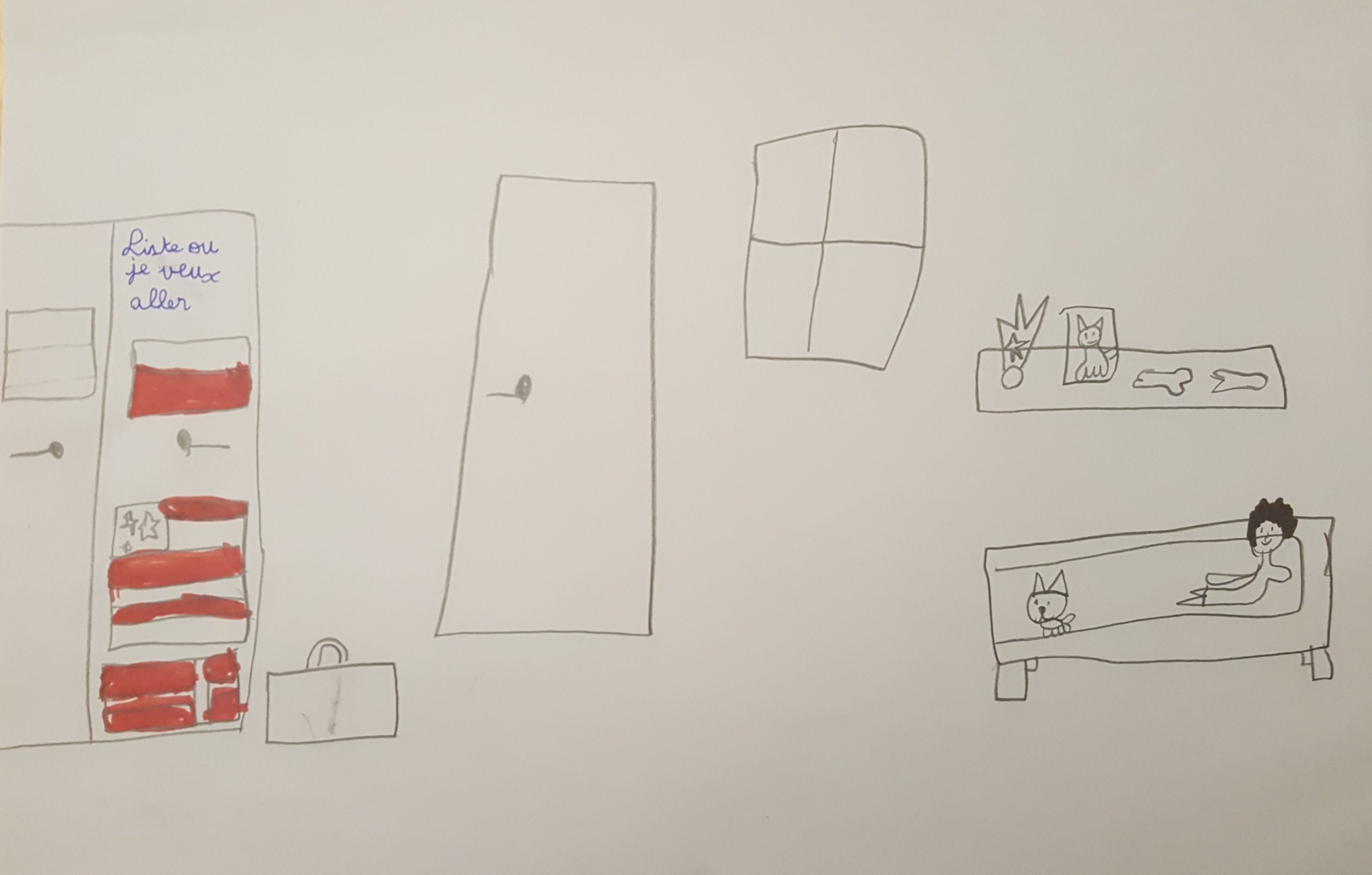 il y a une chambre avec un enfant qui s’appelle Tom et à côté de l’enfant un chat. Ils vont en voyage aux Etats-Unis.