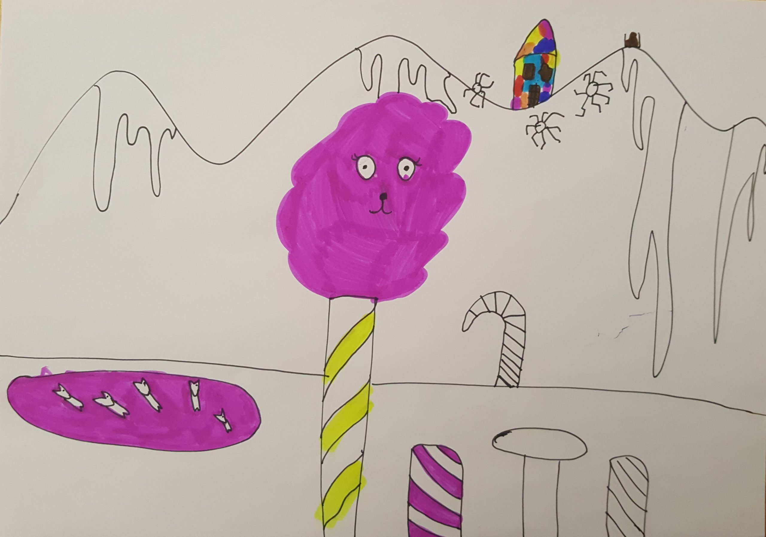 Il y avait des chamallows, et des arbres en barbe à papa à la vanille. Le sol est en confiture, les rochers en Fraises Tagada. La terre est faite en biscuits écrasés au chocolat. Dans le lac, des poissons épicés nagent. Il y a des bonbons crabes et un peu plus loin un océan en jus de fraises.