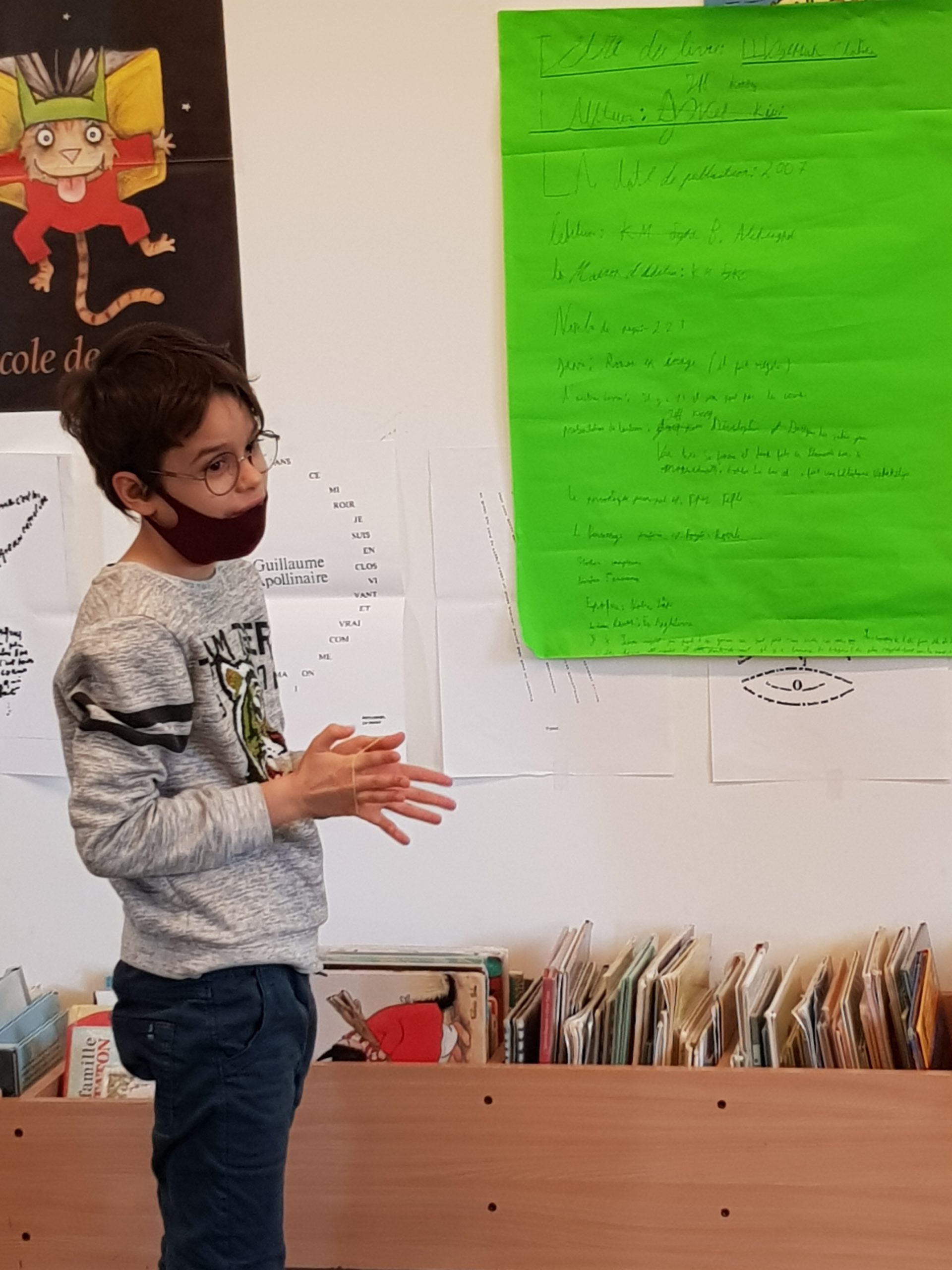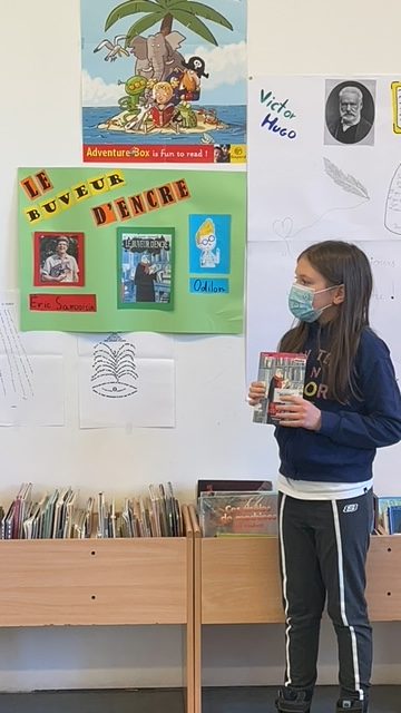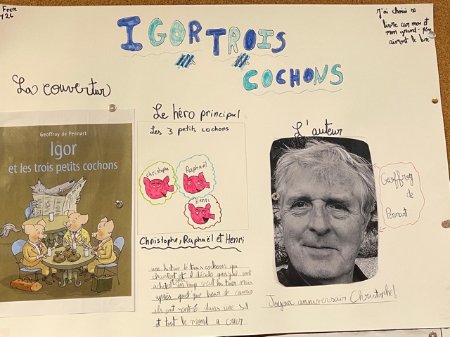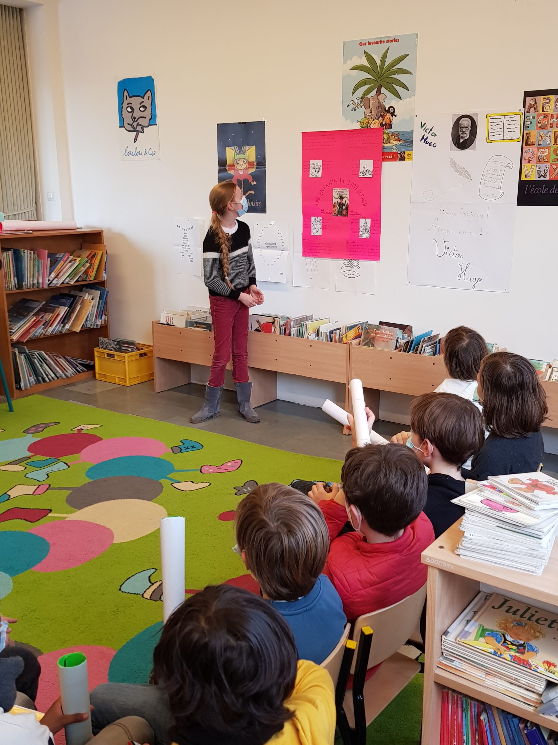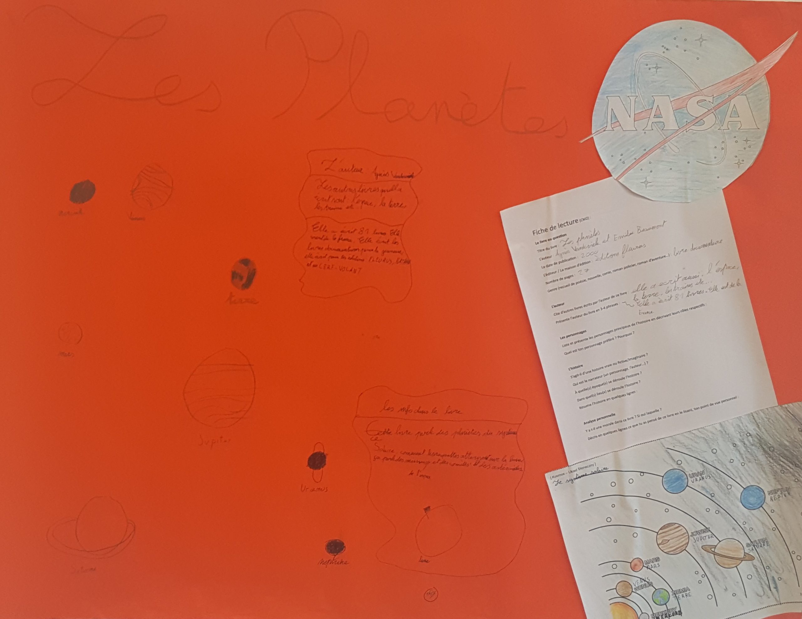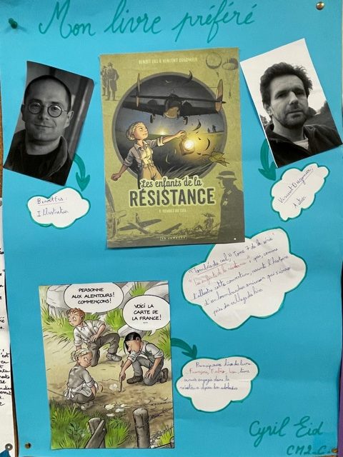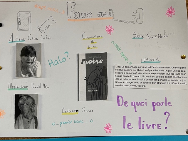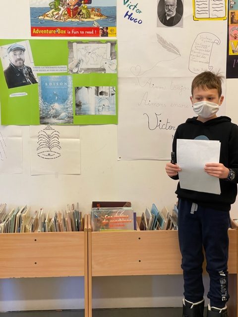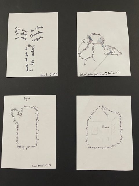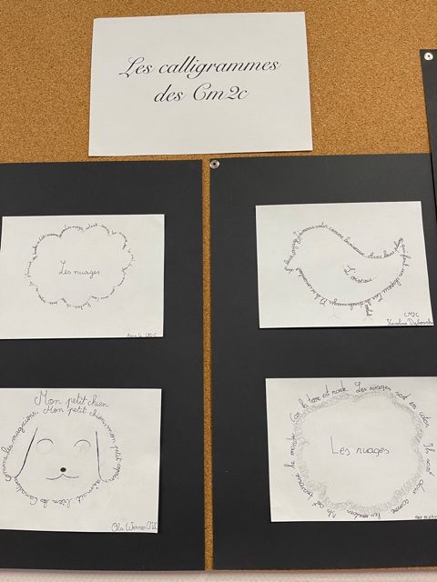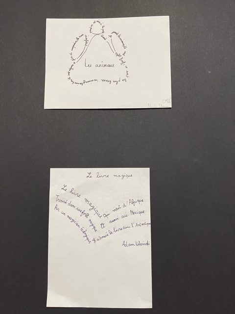 Natomiast uczniowie klas CM2 B i CM2 C wykonali plakaty swoich ulubionych książek i zaprezentowali je kolegom z klasy. Ponadto uczniowie klasy CM2 C także brali udział w warsztatach pisania wierszy i kaligramów.