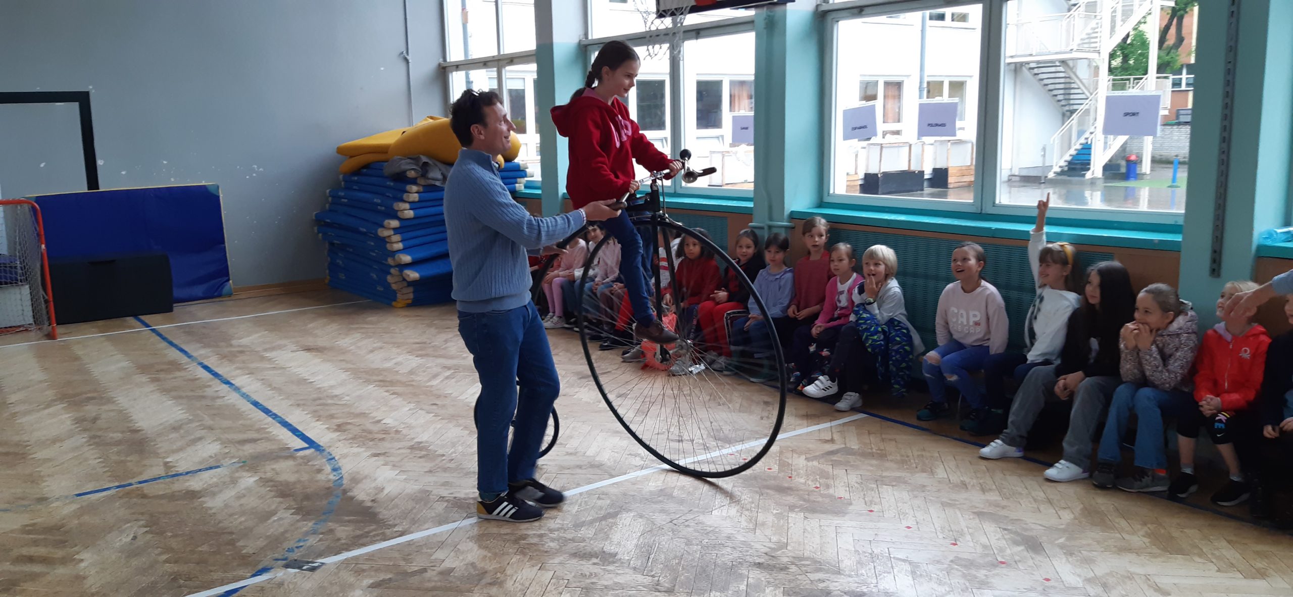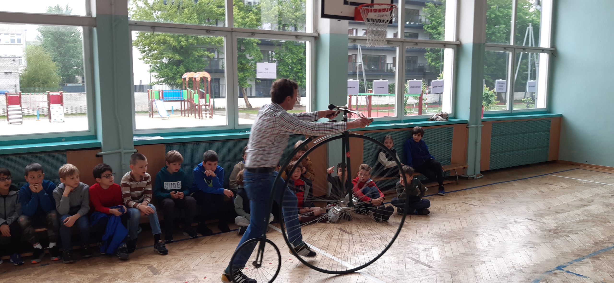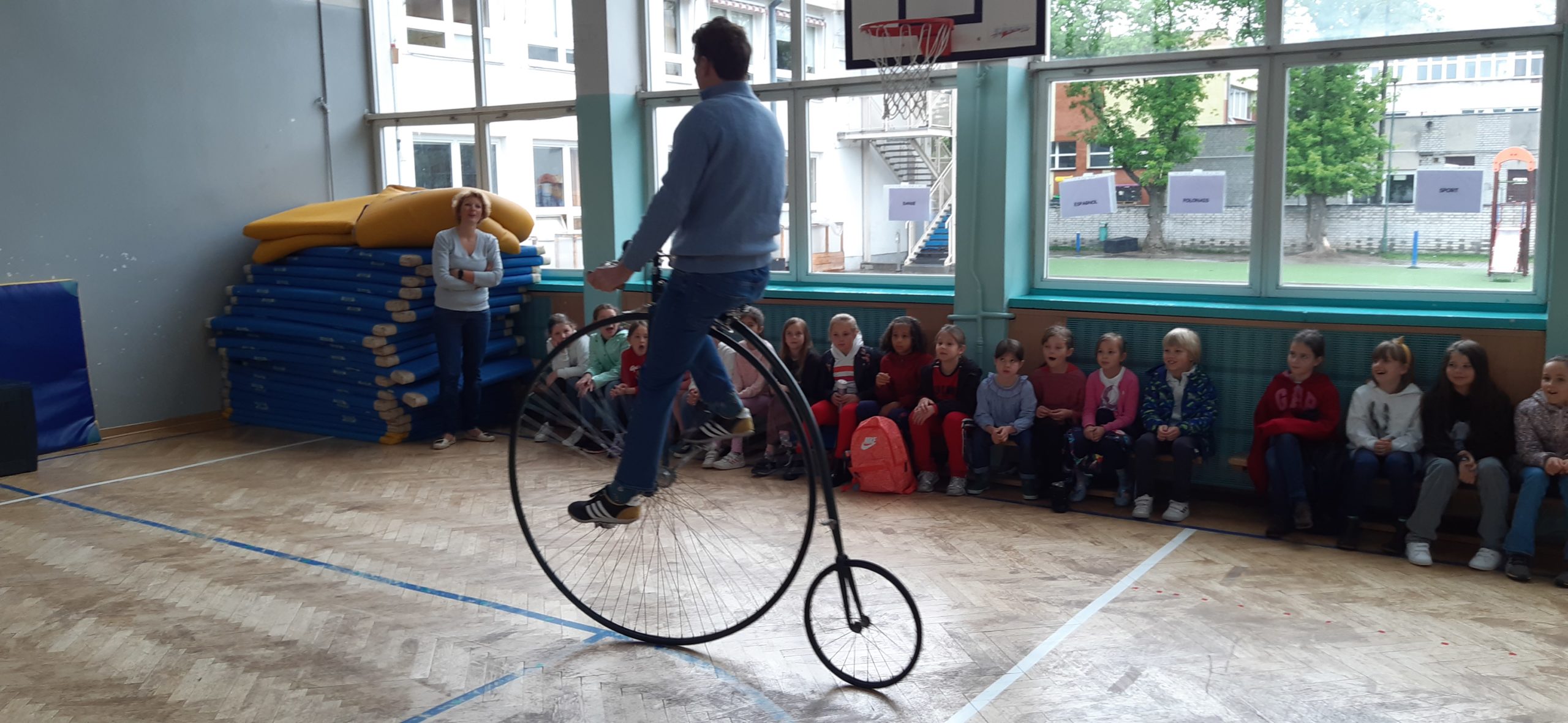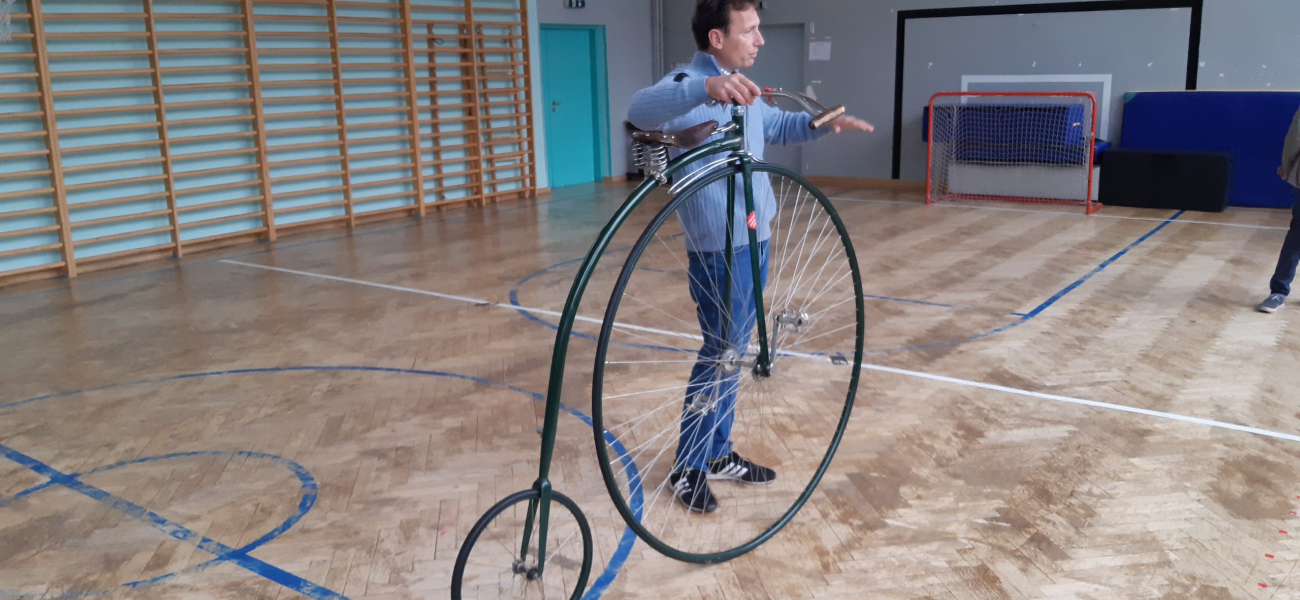 Pod koniec maja pan Lamort de Gail, rodzic jednego z uczniów, był uprzejmy zaprezentować dzieciom bicykl i pozwolił go wypróbować. Nasi młodzi rowerzyści byli pod wielkim wrażeniem rozmiaru kół i bardzo się cieszyli, gdy następnie znaleźli pojazd dostosowany do ich wzrostu.